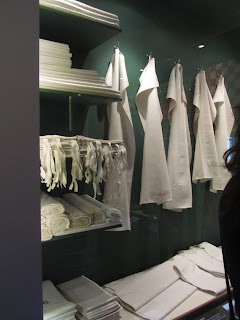 Vi hann ta en runda på stan i Linköping och besöka både tebutik och Panduro. Vi såg också denna fantastiska och fotografiska klänning i ett fönster. Fast vi var egentligen på väg till Gamla Linköping och till den första dagen för utställningen "Kors och tvärs med östgötatextil". Utställningen var inte så stor, men hade en del guldkorn. Bäst tyckte jag om de stickade diademen och att var och en av utställarna gjort varsin vägvisarpil.